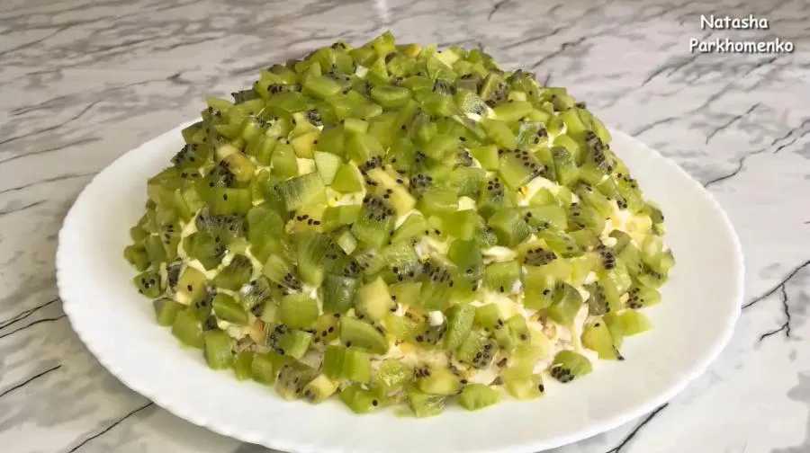 7. В конце нарезаем красиво киви и выкладываем на салат.