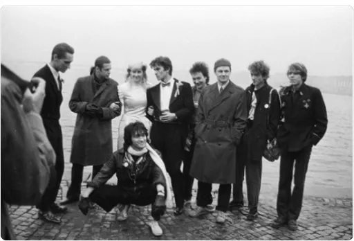 Фото из архива от 02.11.87. Свадьба гитариста «Кино» Ю.Каспаряна и америанки Д. Стингрей. Присутствовали: барабанщик Г. Гурьянов, басист И. Тихомиров, вокалист В. Цой, участники из «Авариума»: вокалист Б. Гребенщиков и басист А.Титов, а также художник А. Крисанов, и актёр С. Африка-Бугаев.