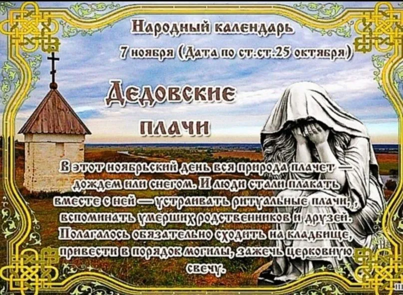 Считается, что в этот осенний день вся природа плачет — дождем или снегом. И люди стали плакать вместе с ней — устраивать ритуальные Дедовские плачи, вспоминать всех своих умерших. Надлежало сходить на кладбище, привести в порядок могилы, зажечь в память о близких и друзьях церковную свечу. А вернувшись с погоста, люди накрывали щедрый стол.