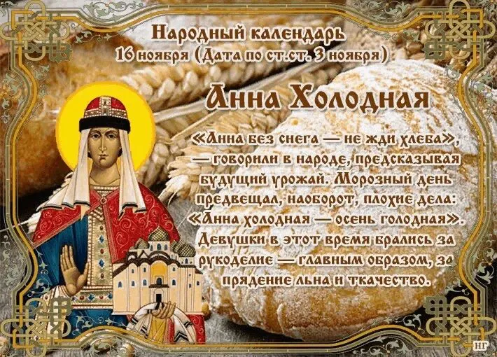В народе её прозвали Анной Холодной, с ней связано много погодных примет. На Руси наблюдали за погодой и в зависимости от того, что видели, говорили: «Анна без снега — не жди хлеба», «Анна холодная — осень голодная». Девушки в этот время брались за прядение льна и ткачество, чему посвящали долгие зимние вечера.