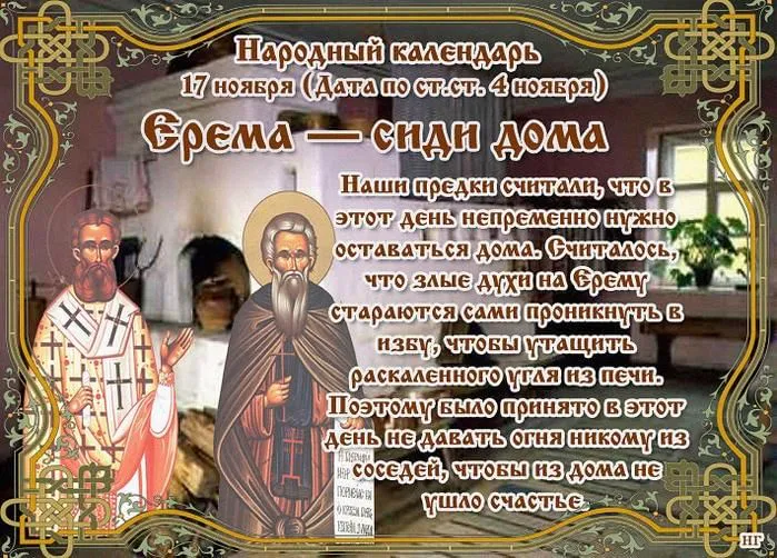 На Руси считали, что в этот день непременно нужно оставаться дома, по возможности не выходить даже во двор, а за ограду — и подавно. Иначе можно столкнуться с нечистой силой и навлечь на себя разнообразные неприятности. Да и погода была под стать общему настроению: «По-за порогу крутит, мутит, беспутит». Отсюда и название праздника: «Ерема – сиди дома».